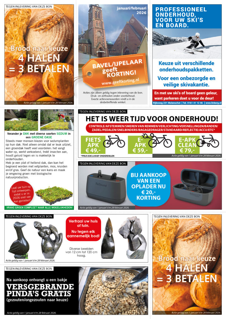 Fiets Fix heeft een Winterbeurt actie voor uw E-bike of gewone fiets. Gérard Kaas en Lekkernij geeft een heerlijk bakje vliespinda’s weg bij aankoop van iets lekkers. Wie wil dat nu niet? Bakkerij van Disseldorp komt weer met de bekende brodenactie: 4 halen=3 betalen. Bij Schram Hoorservice krijgt u gratis een pakje batterijen bij aankoop van 2 stuks. Flash Fashion heeft nu dé EXTRA KORTING modecheque t.w.v. euro 5,00 in de uitverkoop. Voor ski- en board onderhoud moet u natuurlijk weer bij Linberg in Molenschot zijn. Marskramer Bavel geeft weer 15% korting op één product naar keuze. Dit geldt ook voor de sleutelservice!!! Wij zeggen: gewoon doen!