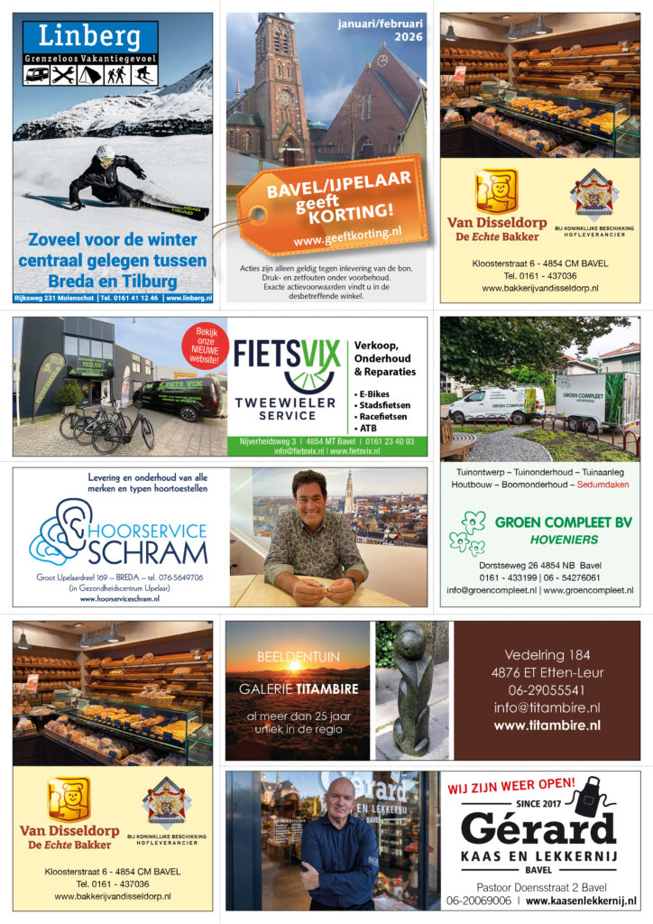 Fiets Fix heeft dit keer weer de grote winterbeurt-actie. Gérard Kaas en Lekkernij geeft gagratis een bakje vers gebrande pinda’s weg. Wie wil dat nu niet? Bakkerij van Disseldorp komt weer met de broden-actie. Schram Hoorservice geeft gratis batterijen bij aankoop van 2. Groen Compleet is dringend op zoek naar HOVENIERS! Linberg heeft de oplossing voor ski- en snowboardonderhoud. Natuurlijk koopt u uw Rituals cadeau bij AD Jessica + Mooi Parfumerie op de Burcht. Laat uw oldtimer verwennen in de winter en ontvang gratis een praktische Philips Inspectie-lamp. En wist u dat Marskramer Bavel ook een Sleutelservice heeft? Kunt u meteen 15% korting krijgen met de bon.